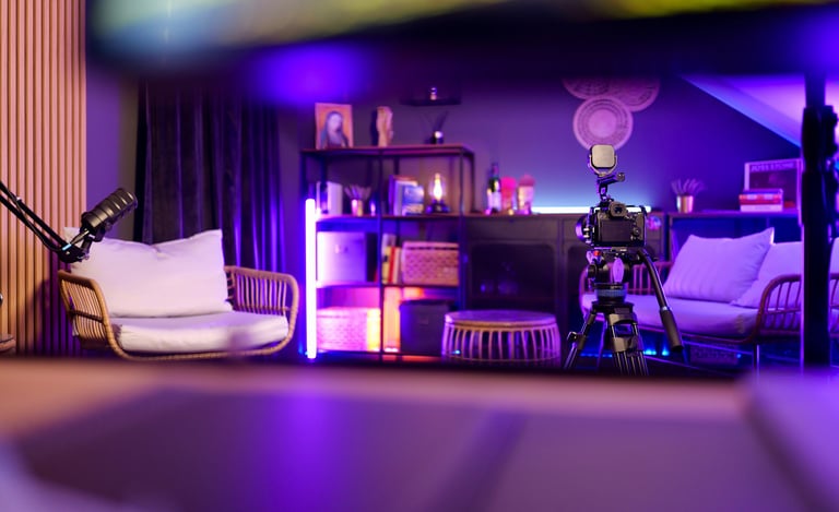 Oba studia oferują kilka możliwości aranżacji: od eleganckiego salonu, przez nowoczesną scenografię edukacyjną, po klimat podcastowy z charakterem - do czterech uczestników.
